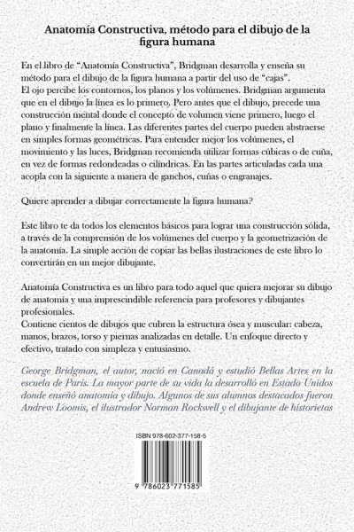 En el libro de "Anatomía Constructiva", Bridgman desarrolla y enseña su método para el dibujo de la figura humana a partir del uso de "cajas". El ojo percibe los contornos, los planos y los volúmenes. Bridgman argumenta que en el dibujo la línea es lo primero. Pero antes que el dibujo, precede una construcción mental donde el concepto de volumen viene primero, luego el plano y finalmente la línea. Las diferentes partes del cuerpo pueden abstraerse en simples formas geométricas. Para entender mejor los volúmenes, el movimiento y las luces, Bridgman recomienda utilizar formas cúbicas o de cuña, en vez de formas redondeadas o cilíndricas. En las partes articuladas cada una acopla con la siguiente a manera de ganchos, cuñas o engranajes. Quiere aprender a dibujar correctamente la figura humana? Este libro te da todos los elementos básicos para lograr una construcción sólida, a través de la comprensión de los volúmenes del cuerpo y la geometrización de la anatomía. La simple acción de copiar las bellas ilustraciones de este libro lo convertirán en un mejor dibujante. Anatomía Constructiva es un libro para todo aquel que quiera mejorar su dibujo de anatomía y una imprescindible referencia para profesores y dibujantes profesionales. Contiene cientos de dibujos que cubren la estructura ósea y muscular: cabeza, manos, brazos, torso y piernas analizadas en detalle. Un enfoque directo y efectivo, tratado con simpleza y entusiasmo.