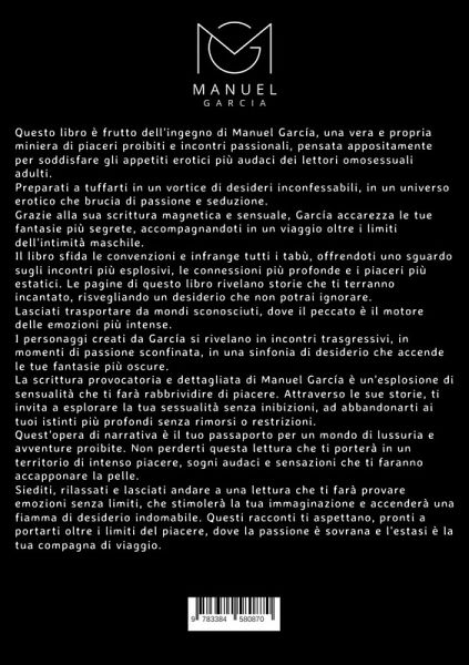Questo libro nasce da un'idea di Manuel García, una vera e propria miniera di piaceri proibiti e incontri passionali, pensata appositamente per soddisfare gli appetiti erotici più audaci dei lettori adulti omosessuali.Preparatevi a tuffarvi in un vortice di desideri inconfessabili, in un universo erotico che brucia di passione e seduzione. Grazie alla sua scrittura magnetica e sensuale, García accarezza le vostre fantasie più segrete, accompagnandovi in un viaggio oltre i limiti dell'intimità maschile.Il libro sfida le convenzioni e infrange tutti i tabù, offrendo uno sguardo agli incontri più esplosivi, ai legami più profondi e ai piaceri più estatici. Le pagine di questo libro rivelano storie che vi terranno incantati, risvegliando un desiderio che non potrete ignorare.Lasciatevi trasportare da mondi sconosciuti, dove il peccato è il motore delle emozioni più intense. I personaggi creati da García si rivelano in incontri trasgressivi, in momenti di passione sconfinata, in una sinfonia di desiderio che accende le vostre fantasie più oscure.La scrittura provocatoria e dettagliata di Manuel García è un'esplosione di sensualità che vi farà rabbrividire di piacere. Attraverso le sue storie, vi invita a esplorare la vostra sessualità senza inibizioni, ad abbandonarvi ai vostri istinti più profondi senza rimorsi o restrizioni.Quest'opera di narrativa è il vostro passaporto per un mondo di lussuria e avventure proibite. Non perdetevi questa lettura che vi porterà in un territorio di piacere intenso, sogni audaci e sensazioni che vi faranno accapponare la pelle.Sedetevi, rilassatevi e lasciatevi andare a una lettura che vi farà provare emozioni senza limiti, che stimolerà la vostra immaginazione e accenderà una fiamma di desiderio indomabile. Questi racconti vi aspettano, pronti a portarvi oltre i limiti del piacere, dove la passione è sovrana e l'estasi è la vostra compagna di viaggio.