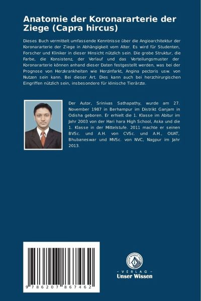 Dieses Buch vermittelt umfassende Kenntnisse über die Angioarchitektur der Koronararterie der Ziege in Abhängigkeit vom Alter. Es wird für Studenten, Forscher und Kliniker in dieser Hinsicht nützlich sein. Die grobe Struktur, die Farbe, die Konsistenz, der Verlauf und das Verteilungsmuster der Koronararterie können anhand dieser Daten festgestellt werden, was bei der Prognose von Herzkrankheiten wie Herzinfarkt, Angina pectoris usw. von Nutzen sein kann. Bei dieser Art. Dies kann auch bei herzchirurgischen Eingriffen nützlich sein, insbesondere für klinische Tierärzte.