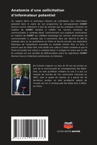 Ce rapport décrit la technique chinoise de sollicitation d'un informateur potentiel dans le cadre de son programme de renseignement HUMINT (human source collection). Il part du principe que les pratiques chinoises en matière de HUMINT tendent à refléter les normes chinoises de communication à contexte élevé, contrairement aux pratiques américaines en matière de HUMINT qui reflètent davantage les normes américaines de communication à contexte bas. Il commence donc par décrire le rôle du contexte dans la vie quotidienne en Chine et fournit ensuite une explication théorique de l'importance accordée au contexte chinois. Pour ce faire, il précise que les États-Unis sont plutôt une culture à faible contexte et que la Chine est plutôt une culture à contexte élevé. Il souligne en outre que le rôle du contexte est une variable de différenciation entre les opérations HUMINT (Human Source Collection) américaines et chinoises.