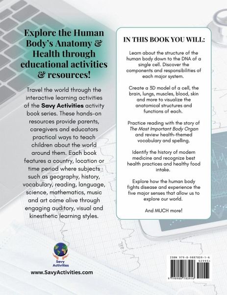 Travel the world through the interactive learning activities of the Savy Activities activity book series. These hands-on resources provide parents, caregivers and educators practical ways to teach children about the world around them. Each book features a country, location or time period where subjects such as geography, history, vocabulary, reading, language, science, mathematics, music and art come alive through engaging auditory, visual and kinesthetic learning styles. Learn about the structure of the human body down to the DNA of a single cell. Discover the components and responsibilities of each major system. Create a 3D model of a cell, the brain, lungs, muscles, blood, skin and more to visualize the anatomical structures and functions of each. Practice reading with the story of The Most Important Body Organ and review health-themed vocabulary and spelling. Identify the history of modern medicine and recognize best health practices and healthy food intake. Explore how the human body fights disease and experience the five major senses that allow us to explore our world. And MUCH more!
