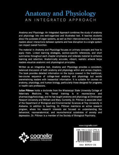Anatomy and Physiology: An Integrated Approach combines the study of anatomy and physiology into one well-organized and illustrated text. It teaches students about the purposes of organ systems, as well as their interconnections. It educates readers about interactions between systems and how disruption to a single system can impact overall function. The material in Anatomy and Physiology focuses on primary concepts and how to apply them. Linked learning strategies, section-specific references, and short summaries throughout each chapter emphasize and reiterate material to enhance learning and retention. Anatomically accurate, vibrant, realistic artwork helps readers visualize anatomic and physiological principles. Written as an integrative text, Anatomy and Physiology provides a consistent, balanced discussion of both anatomy and physiology within and across chapters. The book provides detailed information on the topics covered in the traditional, two-course sequence of college-level anatomy and physiology but avoids overwhelming readers with inessential information. It is suitable for courses on anatomy, physiology, and human biology, particularly those designed for programs in health care professions. Julian Pittman holds a doctorate from the Mississippi State University College of Veterinary Medicine. His formal training is in neuroscience and pharmacology/toxicology, and he has taught anatomy and physiology at Christopher Newport University and William and Mary. Currently Dr. Pittman is Associate Chair of the Department of Biological and Environmental Sciences at Troy University in Alabama. In addition to teaching, Dr. Pittman maintains an active research program, where his research interests are focused on understanding the behavioral, neuroanatomical, and neurochemical substrates of anxiety and depression. Dr. Pittman is a member of the Society of Biological Psychiatry.