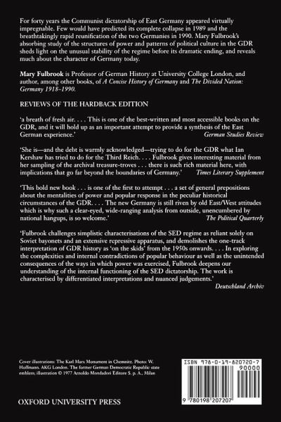 Founded on the ruins of Hitler's defeated Third Reich, and lacking any intrinsic legitimacy, the German Democratic Republic nevertheless became the most stable and successful state in the Soviet bloc. Yet in the "gentle revolution" of 1989 it collapsed with startling speed. How can this extraordinary story of political stability followed by sudden implosion be explained? With the opening of the East German archives, it is at last possible to look inside the apparently impregnable dictatorship. Mary Fulbrook provides a compelling interpretation of structures of power and patterns of popular opinion within the GDR. This absorbing study explores the ways in which the tentacles of the all-pervading state captured East German society in the grip of Stasi, party, and mass organizations, and analyzes the emergence in the 1980s of oppositional cultures under the ambivalent shelter of a Protestant Church which had come to terms with the communist state. In combining careful archival research with broader theoretical and historical interpretation, Anatomy of a Dictatorship makes a major contribution to debates on recent German history and the character of contemporary Germany.