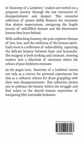 In "Anatomy of a Letdown," readers are invited on a poignant journey through the raw intricacies of disappointment and despair. This evocative collection of poems deftly dissects the moments that shatter expectations, navigating the fragile terrain of unfulfilled dreams and the bittersweet lessons they leave behind. With unflinching honesty, the poet explores themes of love, loss, and the resilience of the human spirit. Each verse is a reflection of vulnerability, capturing the delicate balance between hope and heartache. The imagery is both striking and intimate, drawing readers into a labyrinth of emotions where the echoes of past letdowns resonate. As the pages turn, "Anatomy of a Letdown" serves not only as a mirror for personal experiences but also as a cathartic release for those grappling with their own disappointments. This collection invites you to embrace the beauty within the struggle and find solace in the shared human experience of navigating life's inevitable letdowns.