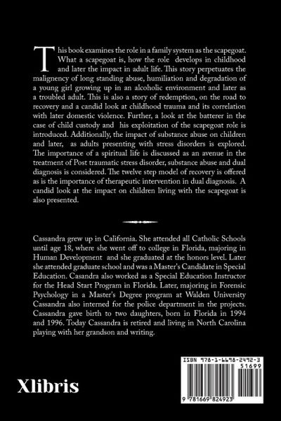 This book examines the role in a family system as the scapegoat. What a scapegoat is, how the role develops in childhood and later the impact in adult life. This story perpetuates the malignency of long standing abuse, humiliation and degradation of a young girl growing up in an alcoholic environment and later as a troubled adult. This is also a story of redemption, on the road to recovery and a candid look at childhood trauma and its correlation with later domestic violence. Further, a look at the batterer in the case of child custody and his exploitation of the scapegoat role is introduced. Additionally, the impact of substance abuse on children and later, as adults presenting with stress disorders is explored. The importance of a spiritual life is discussed as an avenue in the treatment of Post traumatic stress disorder, substance abuse and dual diagnosis is considered. The twelve step model of recovery is offered as is the importance of therapeutic intervention in dual diagnosis. A candid look at the impact on children living with the scapegoat is also presented.