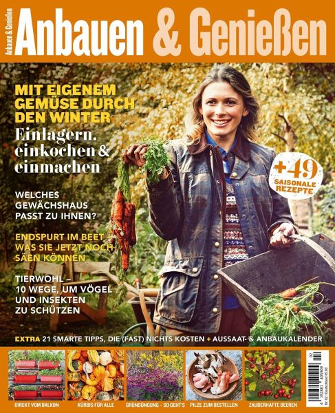 Wer klug sät, erntet das ganze Jahr! Mit unserer ersten Ausgabe von "Anbauen und Genießen" haben wir Sie auf Ihrem Weg zum Selbstversorger begleitet. Mit dem zweiten Teil unserer Reihe möchten wir Ihnen viele nützliche Tipps geben, wie Sie einerseits mit selbst geerntetem Gemüse und Obst durch die kalte Jahreszeit kommen und andererseits Ihren Garten winterfit machen können. Wenn sich mit dem Fallen des Herbstlaubes so langsam der Winter ankündigt, fahren wir erst mal die letzte Ernte ein, bevor die Früchte am Ende noch erfrieren. Und was wir jetzt nicht sofort essen, sollten wir lagern oder einmachen. Wie das richtig geht, erklären wir Ihnen. Wir wollen die Zeit auch nutzen, um neue Beete anzulegen, um zu schauen, ob ein Gewächshaus das richtige für uns sein könnte, oder um die Böden z.¿B. durch Gründüngung zu entlasten. Wer schon wieder Lust auf bunte Blumen verspürt, kann Zwiebelknollen in Containern pflanzen, um eine frühe Blumenpracht zu genießen. Aber darüber hinaus sollten Sie natürlich auch nicht vergessen, den Herbst auch einfach nur zu genießen. Mit unserem Kürbis-Special versorgen wir Sie mit leckeren Rezepten, originellen Deko-Ideen und spannenden Storys von Kürbiszüchtern für die Einstimmung auf diese schöne Jahreszeit. Themenübersicht: . Genussvoll in den Herbst Ein Garten mit Outdoorküche und Rezepten für den Grill . Das große Kürbisfest Kürbisse für jeden Geschmack. Plus: ausgefallene Deko-Ideen . Endspurt im Beet Welche Kräuter und Gemüse Sie jetzt noch sähen können . Ernten und Einlagern Den ganzen Winter über frisches Gemüse essen. So geht's . Ab in den Obstgarten Auf süßes Naschobst muss man auch in der kalten Jahreszeit nicht verzichten . Outdoor oder indoor? Welche Gemüse auf dem Beet überwintern können und welche nicht . Frisch vom Balkon Der richtige Standort, die besten Gefäße und Substrate, die passenden Gemüse . Einkochen und Einmachen Die Praktiken unserer Großeltern sind wieder ganz groß in Mode . Das Gemüsebeet winterfest machen Welche Arbeiten jetzt anfallen . Geschmacks-Highlight Kräuter Ob einfrieren oder trocknen: So hat man lange etwas von ihnen . Ein Herz für Tiere 10 einfache Wege, um Vögel, Säugetiere und Insekten zu schützen . Jetzt schon mal auf den Frühling freuen Blumenzwiebeln nach dem Farbkreis arrangiert. . Zauberhafte Beeren Sie tauchen jeden Garten in ein Meer aus bunten Herbstfarben . Pilze zum Bestellen Wir haben bei einem Pilzzüchter in den Topf geguckt . Das 1 x 1 der Gründüngung Dem ausgelaugten Boden jetzt eine kleine Auffrischung gönnen . Ein Upgrade für Ihren Garten Und das muss überhaupt nicht viel kosten - 21 smarte Tipps . Der perfekte Wohlfühlort für Ihren Garten Warum sich ein Gewächshaus - egal in welcher Größe - immer lohnt . Herbstgemüse - und was man Leckeres daraus zaubern kann. Z.¿B. eine Taboulé mit Grünkohl . Herbstfrüchte Von der Earl-Grey-Torte bis zur herbstlichen Pavlova.