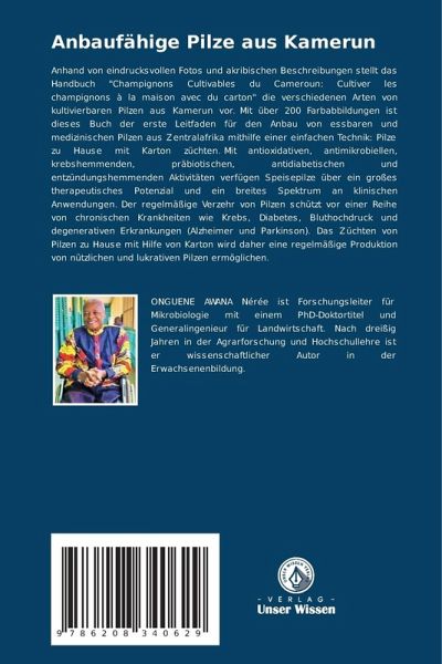 Anhand von eindrucksvollen Fotos und akribischen Beschreibungen stellt das Handbuch "Champignons Cultivables du Cameroun: Cultiver les champignons à la maison avec du carton" die verschiedenen Arten von kultivierbaren Pilzen aus Kamerun vor. Mit über 200 Farbabbildungen ist dieses Buch der erste Leitfaden für den Anbau von essbaren und medizinischen Pilzen aus Zentralafrika mithilfe einer einfachen Technik: Pilze zu Hause mit Karton züchten. Mit antioxidativen, antimikrobiellen, krebshemmenden, präbiotischen, antidiabetischen und entzündungshemmenden Aktivitäten verfügen Speisepilze über ein großes therapeutisches Potenzial und ein breites Spektrum an klinischen Anwendungen. Der regelmäßige Verzehr von Pilzen schützt vor einer Reihe von chronischen Krankheiten wie Krebs, Diabetes, Bluthochdruck und degenerativen Erkrankungen (Alzheimer und Parkinson). Das Züchten von Pilzen zu Hause mit Hilfe von Karton wird daher eine regelmäßige Produktion von nützlichen und lukrativen Pilzen ermöglichen.