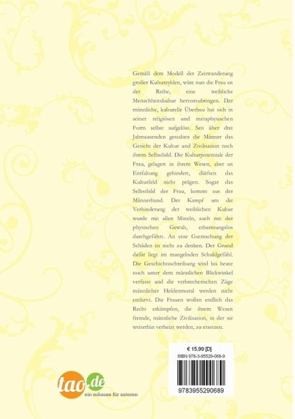 Gemäß dem Modell der Zeitwanderung großer Kulturzyklen, wäre nun die Frau an der Reihe, eine weibliche Menschheitskultur hervorzubringen. Der männliche, kulturelle Überbau hat sich in seiner religiösen und metaphysischen Form selbst aufgelöst. Seit über drei Jahrtausenden gestalten die Männer das Gesicht der Kultur und Zivilisation nach ihrem Selbstbild. Die Kulturpotentiale der Frau, gelagert in ihrem Wesen, aber an Entfaltung gehindert, dürften das Kulturfeld nicht prägen. Sogar das Selbstbild der Frau, kommt aus der Männerhand. Der Kampf um die Verhinderung der weiblichen Kultur wurde mit allen Mitteln, auch mit der physischen Gewalt, erbarmungslos durchgeführt. An eine Gutmachung der Schäden ist nicht zu denken. Der Grund dafür liegt im mangelnden Schuldgefühl. Die Geschichtsschreibung wird bis heute noch unter dem männlichen Blickwinkel verfasst und die verbrecherischen Züge männlicher Heldenmoral werden nicht entlarvt. Die Frauen wollen endlich das Recht erkämpfen, die ihrem Wesen fremde, männliche Zivilisation, in der sie weiterhin verheizt werden, zu ersetzen.Das Urelement der weiblichen Kultur wurde der Frau entzogen. Aus ihrem Kern heraus konnte sie ihre Werte und Tugenden nicht mehr objektivieren. Statt dessen war sie gezwungen, in den männlichen Gewässern zu schwimmen. Eingesperrt im weiblichen Haushalt, der Willkür männlicher Götter ausgesetzt, lebte sie im fremden Revier und wurde von Speisen ernährt, die an ihrer geistigen und psychischen Gesundheit Schäden angerichtet haben.Das Schicksal der Menschheit entscheidet sich im Verhalten der modernen Frauen: sollen sie der Einladung folgen und das Geschäft der materiellen Zivilisation ausbauen helfen oder den Hauptakzent ihrer Kreativität auf die vernachlässigte Selbsterkenntnis als Frau setzen und aus dieser Erkenntnis heraus eine neue Transzendenz vermitteln, neue Metaphysik, Ethik, Kunst, Philosophie und Jurisprudenz formulieren? Wenn die Frau der Anziehungskraft der männlichen Zivilisation, die ja ihrem Wesen fremd ist, nicht widersteht und ihre Interessen nur noch im Kampf um die Gleichberechtigung sieht, bleibt sie weiterhin im Käfig verdorbener männlicher Geistigkeit eingesperrt und kann von der schönen neuen Frauenwelt nur noch träumen. Sie würde sich bis in die tiefsten Schichten ihres Wesens vermännlichen, mit allen Folgeschäden an ihrer Psyche und bliebe dem nie gelöschten Frauenhass ausgesetzt.