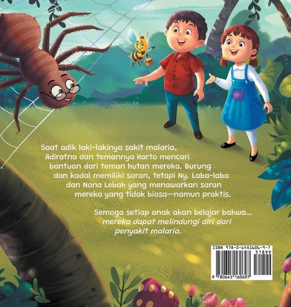 Saat adik laki-lakinya sakit malaria, Adiratna dan temannya Harto mencari bantuan dari hewan-hewan di sekitar mereka. Burung dan biawak memilikisaran, tetapi Ny. Laba-laba dan Nona Lebah yang memberikan solusi yang tidak biasa, namun sangat membantu. Semoga setiap anak akan belajar dan memahami bahwä mereka dapat melindungi diri dari penyakit malaria.