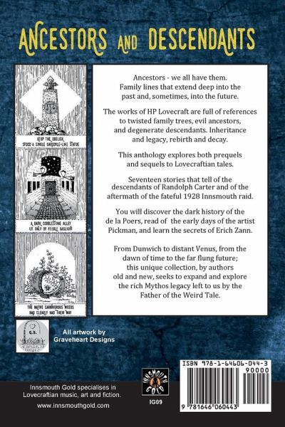 Ancestors - we all have them. Family lines that extend deep into the past and, sometimes, into the future. The works of HP Lovecraft are full of references to twisted family trees, evil ancestors, and degenerate descendants. Inheritance and legacy, rebirth and decay. This anthology explores both prequels and sequels to Lovecraftian tales.Seventeen stories, tales that tell of the descendants of Randolph Carter and of the aftermath of the fateful 1928 Innsmouth raid. You will discover the dark history of the de la Poers, read of the early days of the artist Pickman, learn the secrets of Erich Zann. From Dunwich to distant Venus, from the dawn of time to the far flung future; this unique collection, by authors old and new, seeks to expand and explore the rich Mythos legacy left to us by the Father of the Weird Tale. CONTENTS The Events at Exham Priory Robert Poyton A Brief Delay on the Road to San Bernardino B Harlan Crawford Sympathetic Vibrations Lee Clark Zumpe His Last Summer Russell Smeaton Portrait of the Artist Frank Coffman The Acquisition of Mariah Lieberman Peter Rawlik The Shadow Over America John Houlihan Crepitus Mark Jenkins Whatever Happened to Bobby Lee? Eduardo Peret Bad Dream Chris Halliday The Derelict in the Dock John A DeLaughter The Lullaby of Erich Zann GK Lomax Twilight of the Gods Glynn Owen Barrass Memories Tony Bradbury Nyarlathotep 2030 ( or A Dark Carnival) Ian Delacroix Beneath the Walls of Eryx Dickon Springate The Nyarlathotep Experience Miguel Fliguer