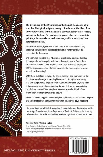 The Dreaming, or the Dreamtime, is the English translation of a complex Aboriginal religious concept. It relates to the idea of an ancestral presence which exists as a spiritual power that is deeply present in the land. This presence or power also exists in certain paintings, in some dance performances, and in songs, blood and ceremonial objects.In Ancestral Power, Lynne Hume seeks to further our understanding of human consciousness by looking through a Western lens at the concept of the Dreaming. She examines the idea that Aboriginal people may have used certain techniques for entering altered states of consciousness. Could their experiences in such states, together with their extensive knowledge of their environment, have helped to create the cosmological scheme we call the Dreaming?With these questions in mind, she brings together and examines, for the first time, a wide range of existing literature on Aboriginal cosmology and spiritual practices, together with studies of Aboriginal art, data from anthropologists and ethnomusicologists, and statements by Aboriginal people from many different regional areas of Australia. Much of the information she highlights is little known.Ancestral Power suggests that Aboriginal spirituality is much more complex and compelling than the early missionaries could ever have imagined.