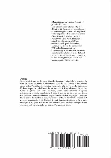 Si muore di giorno, per la strada. Quando si contano i minuti che ci separano da casa. Si muore lavorando e prendendo a botte la vita. "Anche le mie viscere sanno di fiori" significa devo sputare fuori quello che provo, perché necessario. E allora scopro che solo l'amore ha un senso, se si riesce ad amare oltre modo. Oltre la gabbia. Ma siamo rinchiusi, siamo semi-sterilizzati. Vogliono interrompere la nostra eiaculazione di soggettività. C'è un però, un però triste, ma liberatore. Siamo esseri umani, capaci di trasformare il linguaggio. Lasciando tracce di noi, lasciandole a caso, impresse di getto sul pavimento. Evadere dal mondo, occupandolo di sé. Riscoprirsi ragni, buttandosi addosso a chi si ama, senza paure. La pelle si fa nostra, solo se la vita torna ad essere fatta per essere vissuta. Si può scrivere anche per questo. Per iniziare a vivere.