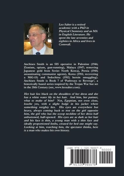 Anchises Smith is an SIS operative in Palestine (1946; Zionism, opium, gun-running), Malaya (1947; removing Japanese gold from Soviet North Korea), Persia (1948; assassinating communist agents), Korea (1951; recovering a MiG-15) and Indochina (1952; heroin smuggling). Her hair lies black on the shoulders of her dress and she has a white water lily in her hair. And him, her partner, what to make of him? Not, Egyptian, not even close, louche yes, with a slight bulge in his jacket where something weighty lies. His eyes are everywhere but heavy, always coming back to rest on the girl opposite him, the girl who has the scoop neckline of her dress half unbuttoned, half-opened. His eyes are as dark as her hair and his face is thin, a young man with a thin face and ideally proportioned limbs, created for bed one might say. Looking at him, watching him, the spectator thinks, here is a man who makes his own history.