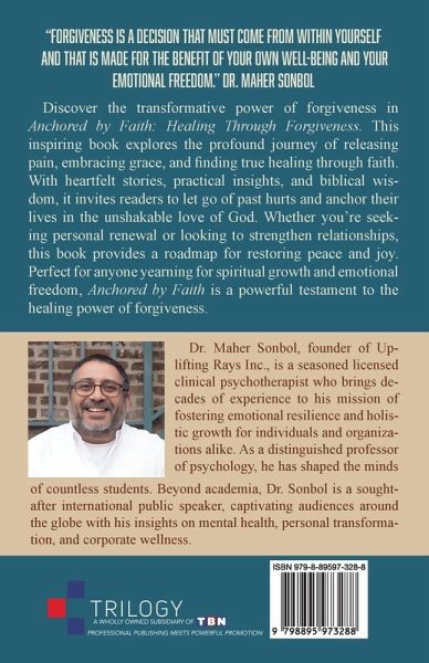 "Forgiveness is a decision that must come from within yourself and that is made for the benefit of your own well-being and your emotional freedom." Dr. Maher Sonbol Discover the transformative power of forgiveness in Anchored by Faith: Healing Through Forgiveness. This inspiring book explores the profound journey of releasing pain, embracing grace, and finding true healing through faith. With heartfelt stories, practical insights, and biblical wisdom, it invites readers to let go of past hurts and anchor their lives in the unshakable love of God. Whether you're seeking personal renewal or looking to strengthen relationships, this book provides a roadmap for restoring peace and joy. Perfect for anyone yearning for spiritual growth and emotional freedom, Anchored by Faith is a powerful testament to the healing power of forgiveness.