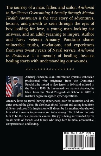 The journey of a man, father, and sailor, Anchored in Resilience: Overcoming Adversity through Mental Health Awareness is the true story of adventures, lessons, and growth as seen through the eyes of boy looking for love, a young man looking for answers, and an adult yearning to inspire. Author and Navy veteran Amaury Ponciano shares vulnerable truths, revelations, and experiences from over twenty years of Naval service. Anchored in Resilience is a memoir of healing-because healing starts with understanding our wounds.