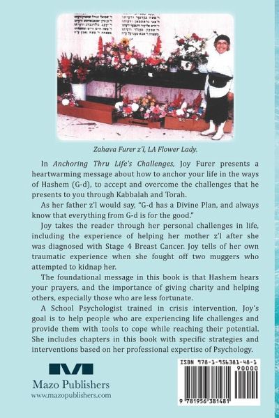 This is a book about Torah, Chesed, Mitzvos and Emuna. In Anchoring Thru Life's Challenges, Joy Furer presents a heartwarming message about how to anchor your life in the ways of Hashem and to accept and overcome the challenges presented to you through Torah. Joy takes the reader through her personal challenges in life, including the experience of helping her mother z'l after she was diagnosed with Stage 4 Breast Cancer. Joy tells of her own traumatic experience when she fought off two muggers who attempted to kidnap her. The foundational message in this book is that Hashem hears your prayers, and the importance of giving charity and helping others, especially those who are less fortunate.