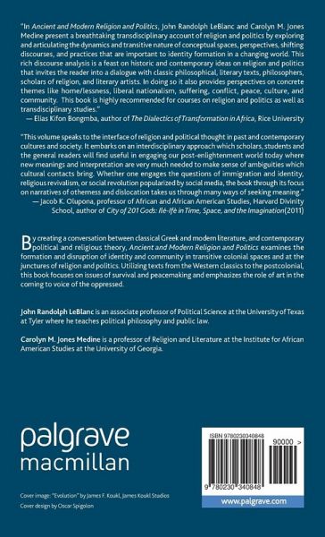 "In Ancient and Modern Religion and Politics, John Randolph LeBlanc and Carolyn M. Jones Medine present a breathtaking transdisciplinary account of religion and politics by exploring and articulating the dynamics and transitive nature of conceptual spaces, perspectives, shifting discourses, and practices that are important to identity formation in a changing world. This rich discourse analysis is a feast on historic and contemporary ideas on religion and politics that invites the reader into a dialogue with classic philosophical, literary texts, philosophers, scholars of religion, and literary artists. In doing so it also provides perspectives on concrete themes like home/lessness, liberal nationalism, suffering, conflict, peace, culture and community. This book is highly recommended for courses on religion and politics as well as transdisciplinary studies." - Elias Kifon Bongmba, author of The Dialectics of Transformation in Africa, Rice University