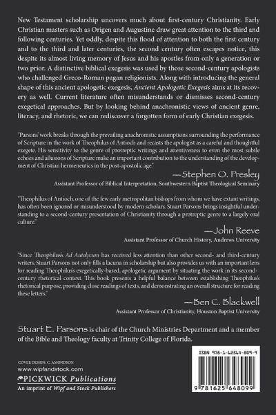 New Testament scholarship uncovers much about first-century Christianity. Early Christian masters such as Origen and Augustine draw great attention to the third and following centuries. Yet oddly, despite this flood of attention to both the first century and to the third and later centuries, the second century often escapes notice, this despite its almost living memory of Jesus and his apostles from only a generation or two prior. A distinctive biblical exegesis was used by those second-century apologists who challenged Greco-Roman pagan religionists. Along with introducing the general shape of this ancient apologetic exegesis, Ancient Apologetic Exegesis aims at its recovery as well. Current literature often misunderstands or dismisses second-century exegetical approaches. But by looking behind anachronistic views of ancient genre, literacy, and rhetoric, we can rediscover a forgotten form of early Christian exegesis.