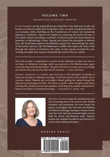 DEVELOPED UNDER THE SHADOWS of the Egyptian temples, Hellenistic astrology is an ancient form of divination inherited from Mesopotamian wisdom traditions. Distilled in Græco-Roman antiquity, and refined in the fires of philosophy and astronomy, it forms the bedrock of traditional western astrology (while also bearing profound similarities to Jyotish or Vedic astrology). Drawing on a body of Greek texts that have remained largely untranslated for almost two-thousand years, Demetra George brings the contemporary practice of astrology back to its ancient roots. Scholar, translator, and practitioner, her work reveals the potent cosmological veins that bear the lifeblood of traditional astrology. Ancient Astrology in Theory and Practice is, in essence, a training manual for the study and practice of Hellenistic astrology. In two volumes, it provides the complete foundations and detailed dynamics of ancient chart-reading techniques. Each volume and each technique is richly illustrated with diagrams, example charts, and practical exercises. Volume 2: Delineating Planetary Meaning If the planets are the essential forces ruling life in the sublunary world, the houses are the principles that bring them down to earth and ground them in our everyday reality. Volume two begins by exploring the ancient house system-the twelve topics or places of life-in order to provide a synthesis of planet-based and house-based approaches to distilling meaning from a chart. It then explores the different systems for delineating the rulers and lords of the nativity as a whole. Like the helmsman's rudder that steers the vessel through the waters of existence, the masters and lords of the nativity provide the overarching principles that guide the native's path through life.