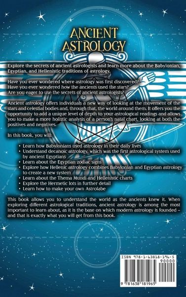 Explore the secrets of ancient astrologists and learn more about the Babylonian, Egyptian, and Hellenistic traditions of astrology. Have you ever wondered where astrology was first discovered? Have you ever wondered how the ancients used the stars? Are you eager to use the secrets of ancient astrologists? Ancient astrology offers individuals a new way of looking at the movement of the stars and celestial bodies and, through that, the world around them. It offers you the opportunity to add a unique level of depth to your astrological readings and allows you to make a more holistic analysis of a person's natal chart, looking at both the positives and negatives. In this book, you will:Learn how Babylonians used astrology in their daily lives Understand decanoic astrology, which was the first astrological system used by ancient Egyptians Learn about the Egyptian zodiac signs Explore how Hellenic astrology combines Babylonian and Egyptian astrology to create a new system Learn about the Thema Mundi and Hellenistic charts Explore the Hermetic lots in further detail Learn how to make your own Astrolabe This book allows you to understand the world as the ancients knew it. When exploring different astrological traditions, ancient astrology is among the most important to learn about, as it is the base on which modern astrology is founded - and that is exactly what you will get from this book. Click the "add to cart" button now and enter the world of ancient astrology.