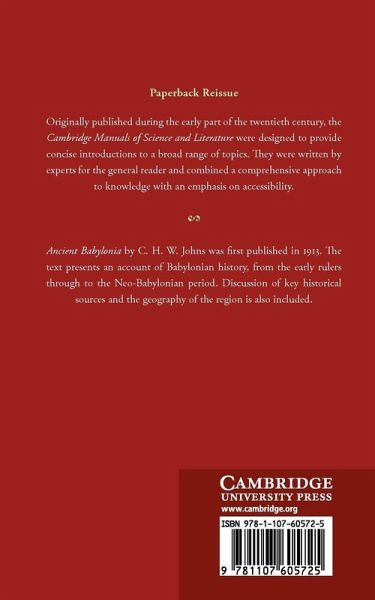 Originally published during the early part of the twentieth century, the Cambridge Manuals of Science and Literature were designed to provide concise introductions to a broad range of topics. They were written by experts for the general reader and combined a comprehensive approach to knowledge with an emphasis on accessibility. Ancient Babylonia by C. H. W. Johns was first published in 1913. The text presents an account of Babylonian history, from the early rulers through to the Neo-Babylonian period. Discussion of key historical sources and the geography of the region is also included.