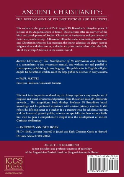Ancient Christianity: The Development of its Institutions and Practices is the fruit of Angelo Di Berardino's forty years of study, teaching, and writing at the Augustinianum in Rome. In this volume, he offers an overview of the birth and development of Ancient Christianity's institutions and practices in all their variety and diversity. The volume retraces the first five centuries identifying how ecclesiastical institutions arose, developed, and were consolidated into their full maturity. It is a task fraught with difficulty because of the scarcity and fragmentary nature of the information preserved from different geographical regions and people who have inherited distinct traditions. The chronological and geographical context of the evidence presents a challenge for historians looking to provide a more or less unified framework instead of an impressionistic pastiche. Often authors cite a few texts and generalize them, offering a homogeneous but false vision. Insisting on the inclusion of regional and diverse sources, Di Berardino deftly demonstrates that Christianity, from its beginnings and throughout its whole history, has always been multi-faceted. The culmination of decades of research, Ancient Christianity: The Development of Its Institutions and Practices will be an indispensable resource for years to come.