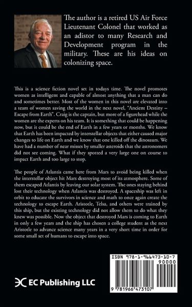 This is a science fiction novel set in todays time. The novel promotes women as intelligent and capable of almost anything that a man can do and sometimes better. Most of the women in this novel are elevated into a team of women saving the world in the next novel, "Ancient Destiny - Escape from Earth". Craig is the captain, but more of a figurehead while the women are the experts on his team. It is something that could be happening now, but it could be the end of Earth in a few years or months. We know that Earth has been impacted by interstellar objects that either caused major changes to life on Earth and we know that one killed off the dinosaurs. We have had a number of near misses by smaller asteroids that the astronomers did not see coming. What if they spotted a very large one on course to impact Earth and too large to stop.The people of Atlantis came here from Mars to avoid being killed when the interstellar object hit Mars destroying most of its atmosphere. Some of them escaped Atlantis by leaving our solar system. The ones staying behind lost their technology when Atlantis was destroyed. A spaceship was left in orbit to educate the survivors in science and math to once again create the technology to escape Earth. Aristotle, Telsa, and others were trained by this ship, but the existing technology did not allow them to do what they knew was possible. Now the object that destroyed Mars is coming to Earth in only a few years and the ship has chosen a college student as the next Aristotle to advance science many years in a very short time in order for some small set of humans to escape into space.