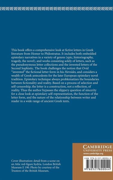 A comprehensive look at fictive letters in Greek literature from Homer to Philostratus, first published in 2001. It includes both embedded epistolary narratives in a variety of genres (epic, historiography, tragedy, the novel), and works consisting solely of letters, such as the pseudonymous letter collections and the invented letters of the Second Sophistic. The book challenges the notion that Ovid 'invented' the fictional letter form in his Heroides and considers a wealth of Greek antecedents for the later European epistolary novel tradition. Epistolary technique always problematizes the boundaries between fictionality and reality. Based on a process of selection and self-censorship, the letter is a construction, not a reflection, of reality. The author bypasses the question of sincerity for a close look at epistolary self-representation, the function of the letter form and the nature of the relationship between writer and reader in a wide range of ancient Greek texts.