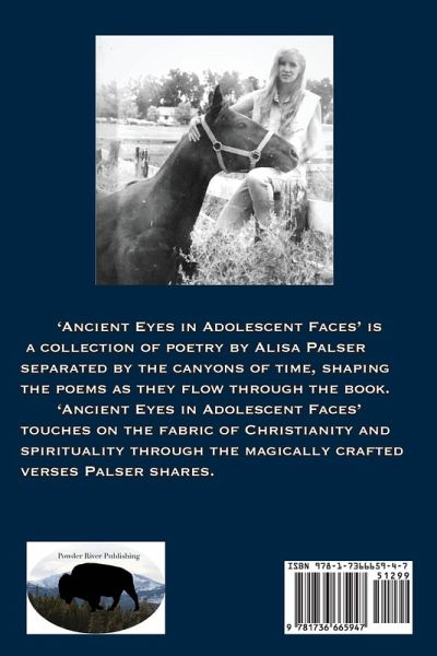 Ancient Eyes in Adolescent Faces is a collection of poetry by Alisa Palser separated by the canyons of time, shaping the poems as they flow through the book. Ancient Eyes in Adolescent Faces touches on the fabric of Christianity and spirituality through the magically crafted verses Palser shares.