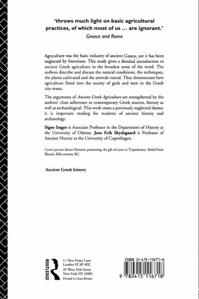 The initial focus of Ancient Greek Agriculture is firmly on the art of agriculture proper, the tools and the technique, the plants cultivated and the animals reared. Thereafter, Isager and Skydsgaard focus on the position of agriculture in the society of gods and men in the Greek city-states . The arguments of Ancient Greek Agriculture are strengthened by the book's close adherence to contemporary Greek sources, literary as well as archaeological, avoiding the use of later as well as Roman material.