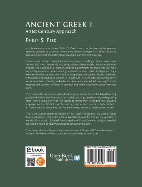 In this elementary textbook, Philip S. Peek draws on his twenty-five years of teaching experience to present the ancient Greek language in an imaginative and accessible way that promotes creativity, deep learning, and diversity. The course is built on three pillars: memory, analysis, and logic. Readers memorize the top 250 most frequently occurring ancient Greek words, the essential word endings, the eight parts of speech, and the grammatical concepts they will most frequently encounter when reading authentic ancient texts. Analysis and logic exercises enable the translation and parsing of genuine ancient Greek sentences, with compelling reading selections in English and in Greek offering starting points for contemplation, debate, and reflection. A series of embedded Learning Tips help teachers and students to think in practical and imaginative ways about how they learn. This combination of memory-based learning and concept- and skill-based learning gradually builds the confidence of the reader, teaching them how to learn by guiding them from a familiarity with the basics to proficiency in reading this beautiful language. Ancient Greek I: A 21st-Century Approach is written for high-school and university students, but is an instructive and rewarding text for anyone who wishes to learn ancient Greek.