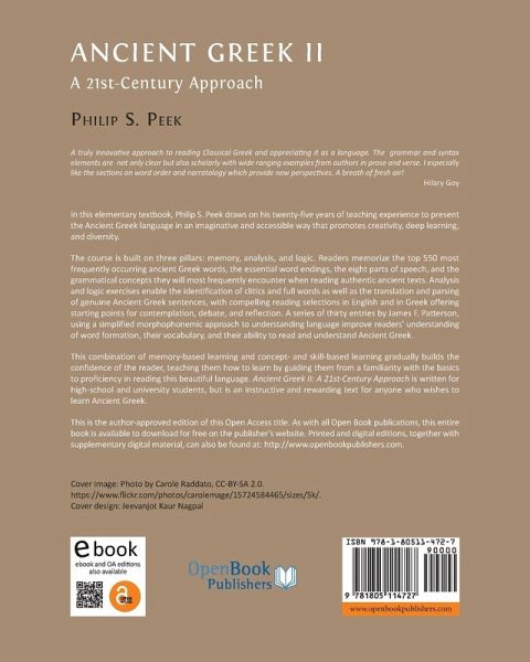 In this elementary textbook, Philip S. Peek draws on his twenty-five years of teaching experience to present the ancient Greek language in an imaginative and accessible way that promotes creativity, deep learning, and diversity. The course is built on three pillars: memory, analysis, and logic. Readers memorize the top 550 most frequently occurring ancient Greek words, the essential word endings, the eight parts of speech, and the grammatical concepts they will most frequently encounter when reading authentic ancient texts. Analysis and logic exercises enable the identification of clitics and full words as well as the translation and parsing of genuine ancient Greek sentences, with compelling reading selections in English and in Greek offering starting points for contemplation, debate, and reflection. A series of thirty entries by James F. Patterson, using a simplified morphophonemic approach to understanding language improve readers' understanding of word formation, their vocabulary, and their ability to read and understand Ancient Greek. This combination of memory-based learning and concept- and skill-based learning gradually builds the confidence of the reader, teaching them how to learn by guiding them from a familiarity with the basics to proficiency in reading this beautiful language. Ancient Greek II: A 21st-Century Approach is written for high-school and university students, but is an instructive and rewarding text for anyone who wishes to learn ancient Greek.