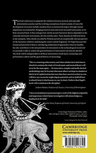 This book endeavours to pinpoint the relations between musical, and especially instrumental, practice and the evolving conceptions of pitch systems. It traces the development of ancient melodic notation from reconstructed origins, through various adaptations necessitated by changing musical styles and newly invented instruments, to its final canonical form. It thus emerges how closely ancient harmonic theory depended on the culturally dominant instruments, the lyre and the aulos. These threads are followed down to late antiquity, when details recorded by Ptolemy permit an exceptionally clear view. Dr Hagel discusses the textual and pictorial evidence, introducing mathematical approaches wherever feasible, but also contributes to the interpretation of instruments in the archaeological record and occasionally is able to outline the general features of instruments not directly attested. The book will be indispensable to all those interested in Greek music, technology and performance culture and the general history of musicology.
