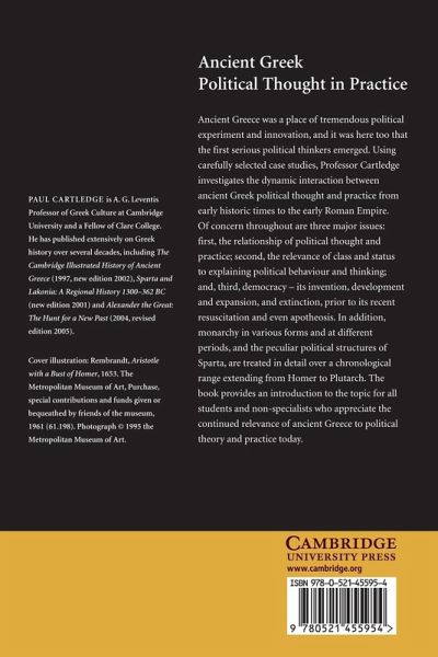 Ancient Greece was a place of tremendous political experiment and innovation, and it was here too that the first serious political thinkers emerged. Using carefully selected case-studies, in this book Professor Cartledge investigates the dynamic interaction between ancient Greek political thought and practice from early historic times to the early Roman Empire. Of concern throughout are three major issues: first, the relationship of political thought and practice; second, the relevance of class and status to explaining political behaviour and thinking; third, democracy - its invention, development and expansion, and extinction, prior to its recent resuscitation and even apotheosis. In addition, monarchy in various forms and at different periods and the peculiar political structures of Sparta are treated in detail over a chronological range extending from Homer to Plutarch. The book provides an introduction to the topic for all students and non-specialists who appreciate the continued relevance of ancient Greece to political theory and practice today.
