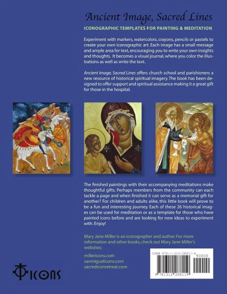 This coloring book is a collection of templates ideal for Iconography. Line drawings can be transferred and enlarged. Experiment with markers, watercolors, crayons, pencils or pastels to create your own iconographic art. Each coloring book image illustrated in the Byzantine style iconography has a small message and ample area for text. If used as a journal, you would write your own insights and thoughts. It becomes a visual journal, where you color the illustrations from ancient iconography. The images are classic; Virgin Mary, Jesus, principle Saints and angels. They are drawn in a variety of styles. At the end you will have a collection of your own. Ancient Image, Sacred Lines offers a coloring book format for church schools and parishioners. The book is a new resource of historical spiritual imagery. The coloring book can serve as graphics for christian clip art, church bulletins, inspirational christian images, Sunday school projects and/or as a person journal and workbook. This Byzantine icon collection of illustrations is offered as a unique and interesting idea, maybe a great gift for those in the hospital. The book has been designed to support and spiritually assist those during their physical stay in the hospital or any timely crisis as it unfolds. It encourages documenting your short memoir, where you color the illustrations as well as write the text. Peak transitions in our lives are often left as a clear memory with no evidence. Mary Jane Miller is a self-taught icon painter with over 25 years of experience. The work has been exhibited in galleries, museums and churches in both the United States and Mexico. She is the author of seven self-published books including Icon Painting Revealed and The Mary Collection. Published online and in publications such as Divine Temple Russian Orthodox Journal and Faith and Forum Magazine. Each year she shares her knowledge and experience by teaching intensive courses and 5 day workshops. Check out her blog for more info and perspectives website: www.sanmiguelicons.com.