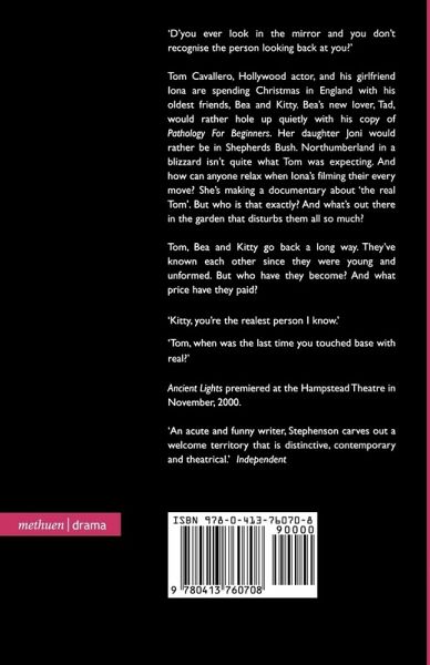 D'you ever look in the mirror and you don't recognise the person looking back at you? Tom Cavallero, Hollywood actor, and his girlfriend Iona are spending Christmas in England with his oldest friends, Bea and Kitty. Bea's new lover, Tad, would rather hole up quietly with his copy of Pathology For Beginners. Her daughter Joni would rather be in Shepherds Bush. Northumberland in a blizzard isn't quite what Tom was expecting. And how can anyone relax when Iona's filming their every move? She's making a documentary about 'the real Tom'. But who is that exactly? And what's out there in the garden that disturbs them all so much? Tom, Bea and Kitty go back a long way. They've known each other since they were young and unformed. But who have they become? And what price have they paid? Ancient Lights premiered at the Hampstead Theatre in November, 2000. "An acute and funny writer, Stephenson carves out a welcome territory that is distinctive, contemporary and theatrical." - Independent
