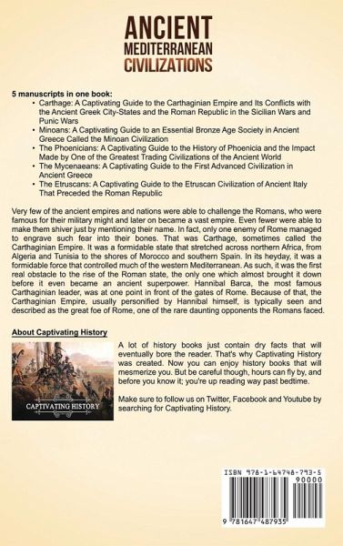 If you want to discover the captivating history of ancient Mediterranean civilizations, then keep reading... Five captivating manuscripts in one book:Carthage: A Captivating Guide to the Carthaginian Empire and Its Conflicts with the Ancient Greek City-States and the Roman Republic in the Sicilian Wars and Punic Wars Minoans: A Captivating Guide to an Essential Bronze Age Society in Ancient Greece Called the Minoan Civilization The Phoenicians: A Captivating Guide to the History of Phoenicia and the Impact Made by One of the Greatest Trading Civilizations of the Ancient World The Mycenaeans: A Captivating Guide to the First Advanced Civilization in Ancient Greece The Etruscans: A Captivating Guide to the Etruscan Civilization of Ancient Italy That Preceded the Roman Republic The first part of the book is about Carthage and here are some of the topics covered:A New City in the West Becoming a Mediterranean Power Fighting for Control over Sicily From Allies to Enemies Succumbing to the Wounds The Carthaginian Society and Government Army of the Carthaginian Republic The Punic Civilization And much, much more! The second part of the book is about the Minoans and here are some of the topics included:Where and When Did the Minoans Live? Known History of the Minoans before the Mycenaeans Society, Culture, and Daily Life Trade and Shipbuilding on the Mediterranean Sea Language and Linear A The Potential Predecessors of Greek Religion Art Architecture Theories about the Collapse of Civilization And much, much more! The third part of the book is about the Phoenicians and here are some of the topics covered:Origins The World of the Phoenicians Political and Legal Structures Daily Life Beauty and Apparel An Unwritten Early History Vassal to the Empires Trade and the Economy Language and Alphabet Religion Warfare Artistry in Multiple Mediums And much, much more! The fourth part of the book is about the Mycenaeans and here are some of the topics included:Political and Military Organization Culture and Daily Life Economy and Trade The Shaft Grave Era, c. 1600 - 1450 BCE The Koine Era, c. 1450 - 1250 BCE The Collapse, c. 1250 - 1100 BCE The Caroline War (1369-1389) The Precursors of Greek Religion Art and Architecture And much, much more! The fifth part of the book is about the Etruscans and here are some of the topics included:Politics, Government, and Social Structure How an Individual Lived The Origin of the Etruscans The Etruscan Orientation, c. 600-400 BCE The Roman Conquest, c. 400-20 BCE Mythology and Religion Art and Music The Etruscan Language and Writing Architecture Surviving Text and Literature And much, much more! So if you want to learn more about ancient Mediterranean civilizations, scroll up and click the "add to cart" button!