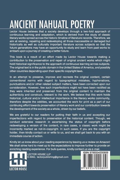Ancient Nahuatl Poetry: Containing The Nahuatl Text Of XXVII Ancient Mexican Poems. With A Translation, Introduction, Notes And Vocabulary. This book is a result of an effort made by us towards making a contribution to the preservation and repair of original classic literature. In an attempt to preserve, improve and recreate the original content, we have worked towards: 1. Type-setting & Reformatting: The complete work has been re-designed via professional layout, formatting and type-setting tools to re-create the same edition with rich typography, graphics, high quality images, and table elements, giving our readers the feel of holding a 'fresh and newly' reprinted and/or revised edition, as opposed to other scanned & printed (Optical Character Recognition - OCR) reproductions. 2. Correction of imperfections: As the work was re-created from the scratch, therefore, it was vetted to rectify certain conventional norms with regard to typographical mistakes, hyphenations, punctuations, blurred images, missing content/pages, and/or other related subject matters, upon our consideration. Every attempt was made to rectify the imperfections related to omitted constructs in the original edition via other references. However, a few of such imperfections which could not be rectified due to intentional\unintentional omission of content in the original edition, were inherited and preserved from the original work to maintain the authenticity and construct, relevant to the work. We believe that this work holds historical, cultural and/or intellectual importance in the literary works community, therefore despite the oddities, we accounted the work for print as a part of our continuing effort towards preservation of literary work and our contribution towards the development of the society as a whole, driven by our beliefs. We are grateful to our readers for putting their faith in us and accepting our imperfections with regard to preservation of the historical content. HAPPY READING!