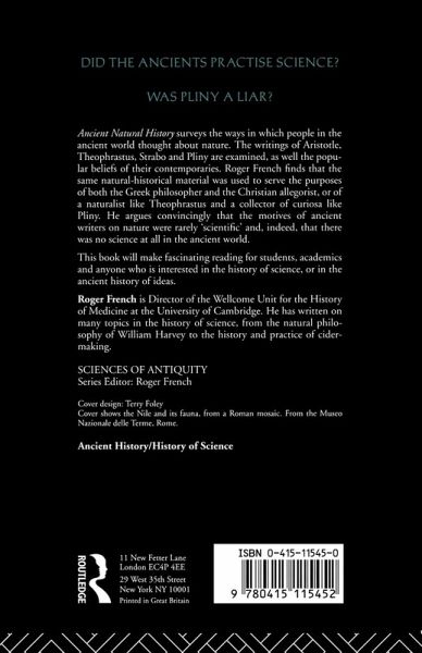 Ancient Natural History surveys the ways in which people in the ancient world thought about nature. The writings of Aristotle, Theophrastus, Strabo, Pliny are examined, as well as the popular beliefs of their contemporaries. Roger French finds that the same natural-historical material was used to serve the purposes of both the Greek philosopher and the Christian allegorist, or of a taxonomist like Theophrastus and a collector of curiosa like Pliny. He argues convincingly that the motives of ancient writers on nature were rarely `scientific' and, indeed, that there was not really any science at all in the ancient world. This book will make fascinating reading for students, academics and anyone who is interested in the history of science, or in the ancient history of ideas.