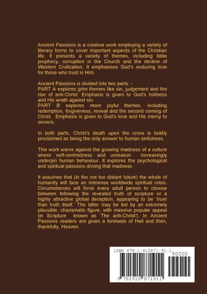 ANCIENT PASSIONS is a work that boldly assumes humanity is facing an immense, global spiritual crisis. It addresses this crisis by offering a well-organised collection of lively exhortations, meditations, poems, prayers and other creative pieces. These are designed to appeal to Christians of all traditions who are interested in spirituality, bible-prophecy or are concerned about the direction that both the church and society is taking. Written over the course of forty-four years, they attempt to probe the overarching psychological and spiritual passions governing human behaviour in its relationship with God PART A explores grim themes like sin, judgement and the rise of anti-Christ. Emphasis is given to God's holiness and His wrath against sin. PART B explores more joyful themes, including redemption, forgiveness, revival and the second coming of Christ. Emphasis is given to God's love and His mercy to sinners. ANCIENT PASSIONS challenges, confronts and comforts people in these perilous times.