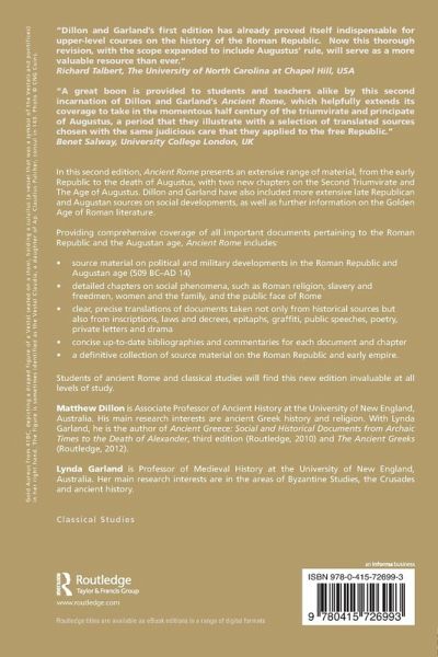 "A great boon is provided to students and teachers alike by this second incarnation of Dillon and Garland's Ancient Rome, which helpfully extends its coverage to take in the momentous half century of the triumvirate and principate of Augustus, a period that they illustrate with a selection of translated sources chosen with the same judicious care that they applied to the free Republic." - Benet Salway, University College London, UK