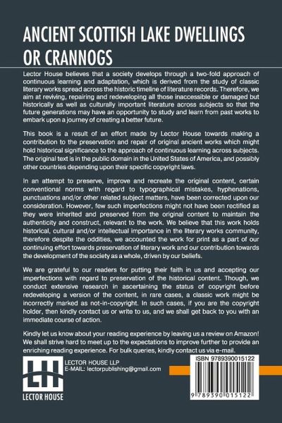 Ancient Scottish Lake Dwellings Or Crannogs: With A Supplementary Chapter On Remains Of Lake-Dwellings In England This book is a result of an effort made by us towards making a contribution to the preservation and repair of original classic literature. In an attempt to preserve, improve and recreate the original content, we have worked towards: 1. Type-setting & Reformatting: The complete work has been re-designed via professional layout, formatting and type-setting tools to re-create the same edition with rich typography, graphics, high quality images, and table elements, giving our readers the feel of holding a 'fresh and newly' reprinted and/or revised edition, as opposed to other scanned & printed (Optical Character Recognition - OCR) reproductions. 2. Correction of imperfections: As the work was re-created from the scratch, therefore, it was vetted to rectify certain conventional norms with regard to typographical mistakes, hyphenations, punctuations, blurred images, missing content/pages, and/or other related subject matters, upon our consideration. Every attempt was made to rectify the imperfections related to omitted constructs in the original edition via other references. However, a few of such imperfections which could not be rectified due to intentional\unintentional omission of content in the original edition, were inherited and preserved from the original work to maintain the authenticity and construct, relevant to the work. We believe that this work holds historical, cultural and/or intellectual importance in the literary works community, therefore despite the oddities, we accounted the work for print as a part of our continuing effort towards preservation of literary work and our contribution towards the development of the society as a whole, driven by our beliefs. We are grateful to our readers for putting their faith in us and accepting our imperfections with regard to preservation of the historical content. HAPPY READING!
