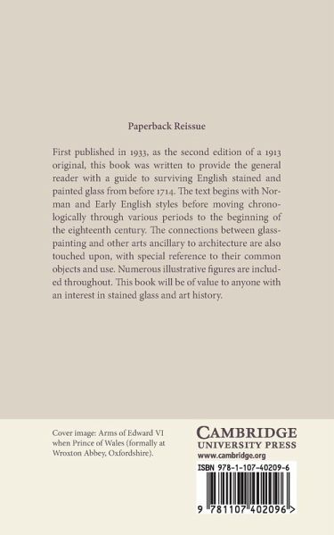 First published in 1933, as the second edition of a 1913 original, this book was written to provide the general reader with a guide to surviving English stained and painted glass from before 1714. The text begins with Norman and Early English styles before moving chronologically through various periods to the beginning of the eighteenth century. The connections between glass-painting and other arts ancillary to architecture are also touched upon, with special reference to their common objects and use. Numerous illustrative figures are included throughout. This book will be of value to anyone with an interest in stained glass and art history.