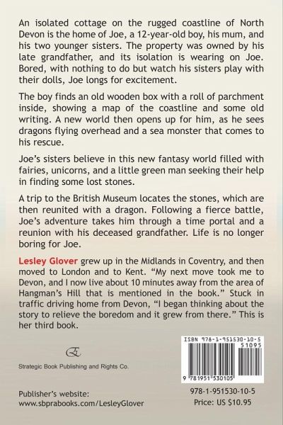 An isolated cottage on the rugged coastline of North Devon is the home of Joe, a 12-year-old boy, his mum, and his two younger sisters. The property was owned by his late grandfather, and its isolation is wearing on Joe. Bored, with nothing to do but watch his sisters play with their dolls, Joe longs for excitement. The boy finds an old wooden box with a roll of parchment inside, showing a map of the coastline and some old writing. A new world then opens up for him, as he sees dragons flying overhead and a sea monster that comes to his rescue. Joe's sisters believe in this new fantasy world filled with fairies, unicorns, and a little green man seeking their help in finding some lost stones. A trip to the British Museum locates the stones, which are then reunited with a dragon. Following a fierce battle, Joe's adventure takes him through a time portal and a reunion with his deceased grandfather. Life is no longer boring for Joe. Author Bio: Lesley Glover grew up in the Midlands in Coventry, and then moved to London and to Kent. "My next move took me to Devon, and I now live about 10 minutes away from the area of Hangman's Hill that is mentioned in the book." Stuck in traffic driving home from Devon, "I began thinking about the story to relieve the boredom and it grew from there." This is her third book.
