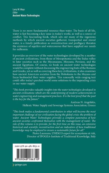 "This book makes a fundamental contribution to what will become the most important challenge of our civilization facing the global crisis: the problem of water. Ancient Water Technologies provides a complete panorama of how ancient societies confronted themselves with the management of water. The role of this volume is to provide, for the first time on this issue, an extensive historical and scientific reconstruction and an indication of how traditional knowledgemay be employed to ensure a sustainable future for all."