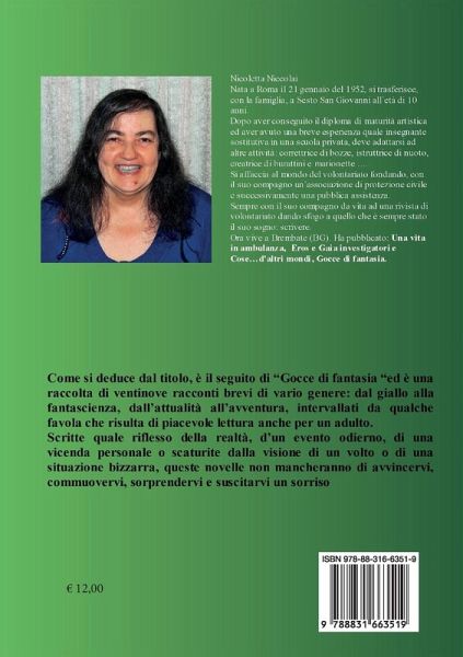 Il libro è il seguito di "Gocce di fantasia "ed è una raccolta di ventinove racconti brevi di vario genere: dal giallo alla fantascienza, dall'attualità all'avventura, intervallati da qualche favola che risulta di piacevole lettura anche per un adulto. Leggendolo, Vi troverete proiettati in un mondo simile alla terra o proverete le emozioni di chi, suo malgrado sarà spedito sulla terra, conoscerete chi può contare su un affetto ultraterreno, chi ha paura dei topi, chi esagera con la critica, chi soffre per la fine di una particolare carriera , chi si farà beffe di un ladro, chi si angoscia per un cane che ha perduto o gioisce per averne trovato un altro e...be, lo scoprirete da soli .Scritte quale riflesso della realtà, d'un evento odierno, di una vicenda personale o scaturite dalla visione di un volto o di una situazione bizzarra, queste novelle non mancheranno di avvincervi ,commuovervi, sorprendervi e suscitarvi un sorriso.