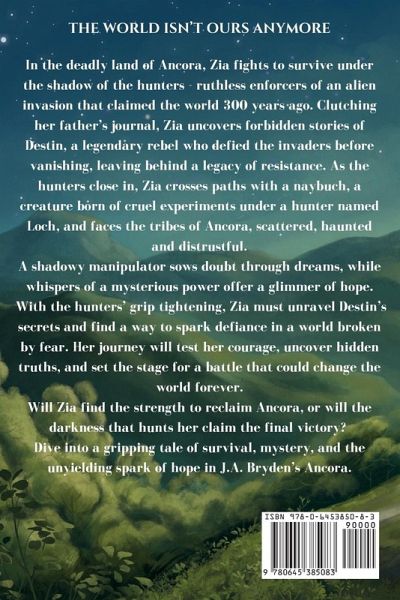 In the deadly land of Ancora, Zia fights to survive under the shadow of the hunters - ruthless enforcers of an alien invasion that claimed the world 300 years ago. Clutching her father's journal, Zia uncovers forbidden stories of Destin, a legendary rebel who defied the invaders before vanishing, leaving behind a legacy of resistance. As the hunters close in, Zia crosses paths with a naybuch, a creature born of cruel experiments under a hunter named Loch, and faces the tribes of Ancora, scattered, haunted and distrustful.A shadowy manipulator sows doubt through dreams, while whispers of a mysterious power offer a glimmer of hope.With the hunters' grip tightening, Zia must unravel Destin's secrets and find a way to spark defiance in a world broken by fear. Her journey will test her courage, uncover hidden truths, and set the stage for a battle that could change the world forever.Will Zia find the strength to reclaim Ancora, or will the darkness that hunts her claim the final victory? Dive into a gripping tale of survival, mystery, and the unyielding spark of hope in J.A. Bryden's Ancora.