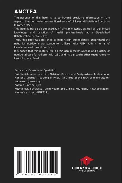 The purpose of this book is to go beyond providing information on the aspects that permeate the nutritional care of children with Autism Spectrum Disorder (ASD).This book is based on the scarcity of similar material, as well as the limited knowledge and practice of health professionals at a Specialized Rehabilitation Centre (CER).Thus, this book was designed to help health professionals understand the need for nutritional assistance for children with ASD, both in terms of knowledge and clinical practice.It is hoped that this material will fill this gap in the knowledge and practice of nutritional care for children with ASD and may provoke other researchers to look into the subject.