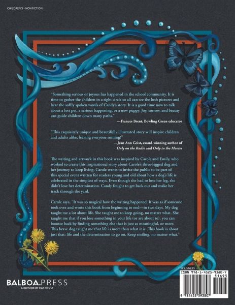 "Something serious or joyous has happened in the school community. It is time to gather the children in a tight circle so all can see the lush pictures and hear the softly spoken words of Candy's story. It is a good time now to talk about a lost pet, a serious happening, or a new puppy. Joy, sorrow, and beauty can guide children down many paths." -Frances Brent, Bowling Green educator "This exquisitely unique and beautifully illustrated story will inspire children and adults alike, leaving everyone smiling!" -Jean Ann Geist, award-winning author of Only on the Radio and Only in the Movies The writing and artwork in this book was inspired by Carole and Emily, who worked to create this inspirational story about Carole's three-legged dog and her journey to keep living. Carole wants to invite the public to be part of this special event written for readers young and old about how a dog's life is celebrated in the simplest of ways. Even though she had to lose her leg, she didn't lose her determination. Candy fought to get back out and make her track through the yard. Carole says, "It was so magical how the writing happened. It was as if someone took over and wrote this book from beginning to end-in two days. My dog taught me a lot about life. She taught me to keep going, no matter what. She taught me that if you lose something in your life (or are about to), you can bounce back by finding something else that is just as meaningful, or more. This brave dog taught me that life is more than what it is. This book is about just that: life and the determination to go on. Keep smiling, no matter what."