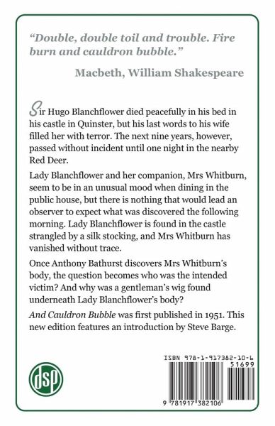 "Double, double toil and trouble. Fire burn and cauldron bubble."Macbeth, William Shakespeare Sir Hugo Blanchflower's died peacefully in his bed in his castle in Quinster, but his last words to his wife filled her with terror. The next nine years, however, passed without incident until one night in the nearby Red Deer. Lady Blanchflower and her companion, Mrs Whitburn, seemed to be in an unusual mood when dining in the public house, but there was nothing that would lead an observer to expect what was discovered the following morning. Lady Blanchflower is found in the castle strangled by a silk stocking, and Mrs Whitburn has vanished without trace. Once Anthony Bathurst discovers Mrs Whitburn's body, the question becomes who was the intended victim? And why was a gentleman's wig found underneath Lady Blanchflower's body? And Cauldron Bubble was first published in 1951. This new edition features an introduction by Steve Barge.